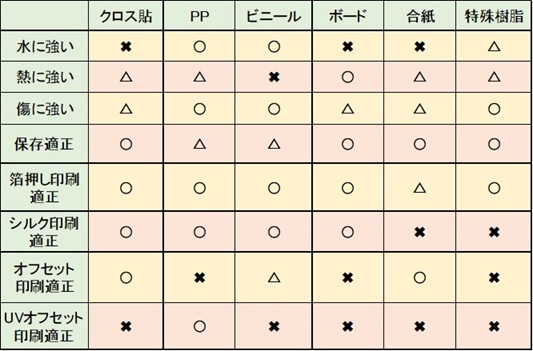表材の種類によって以下の特性がございますので、用途に合わせてご選択ください。